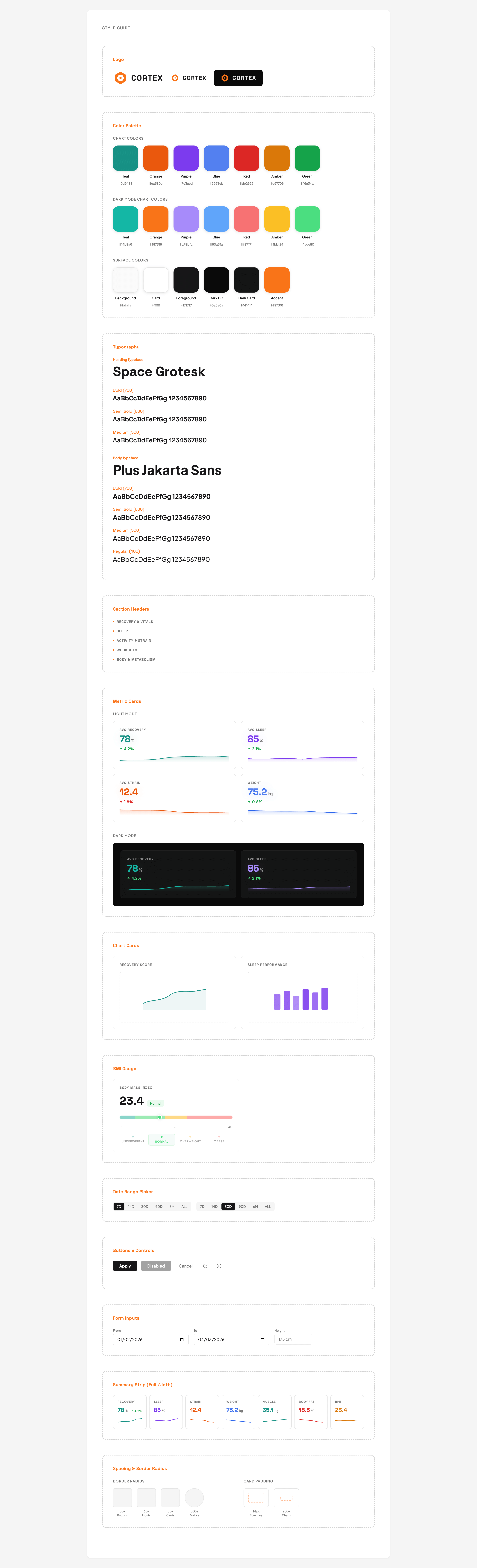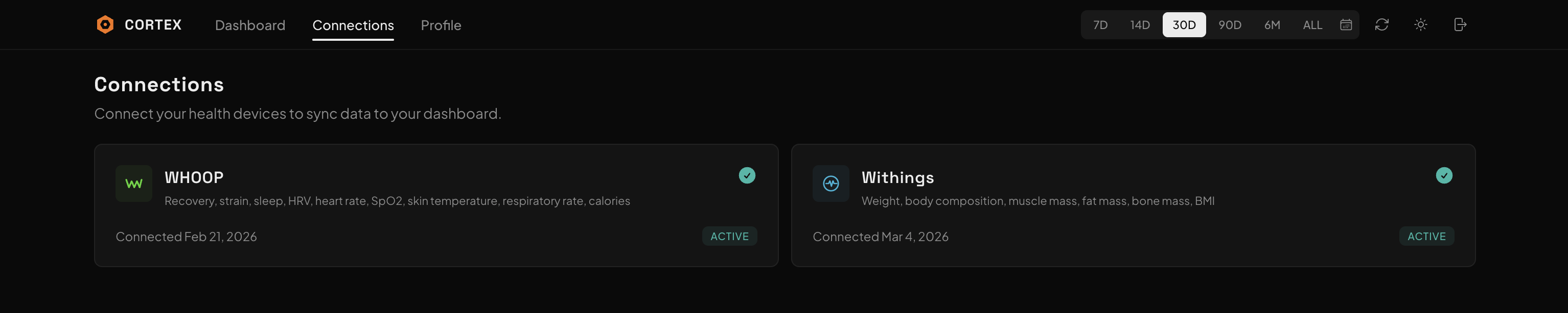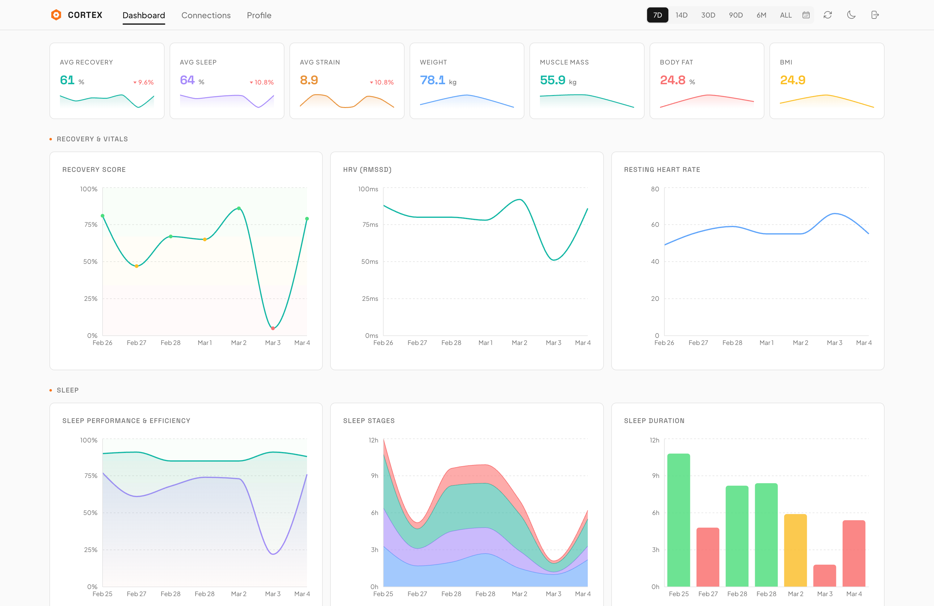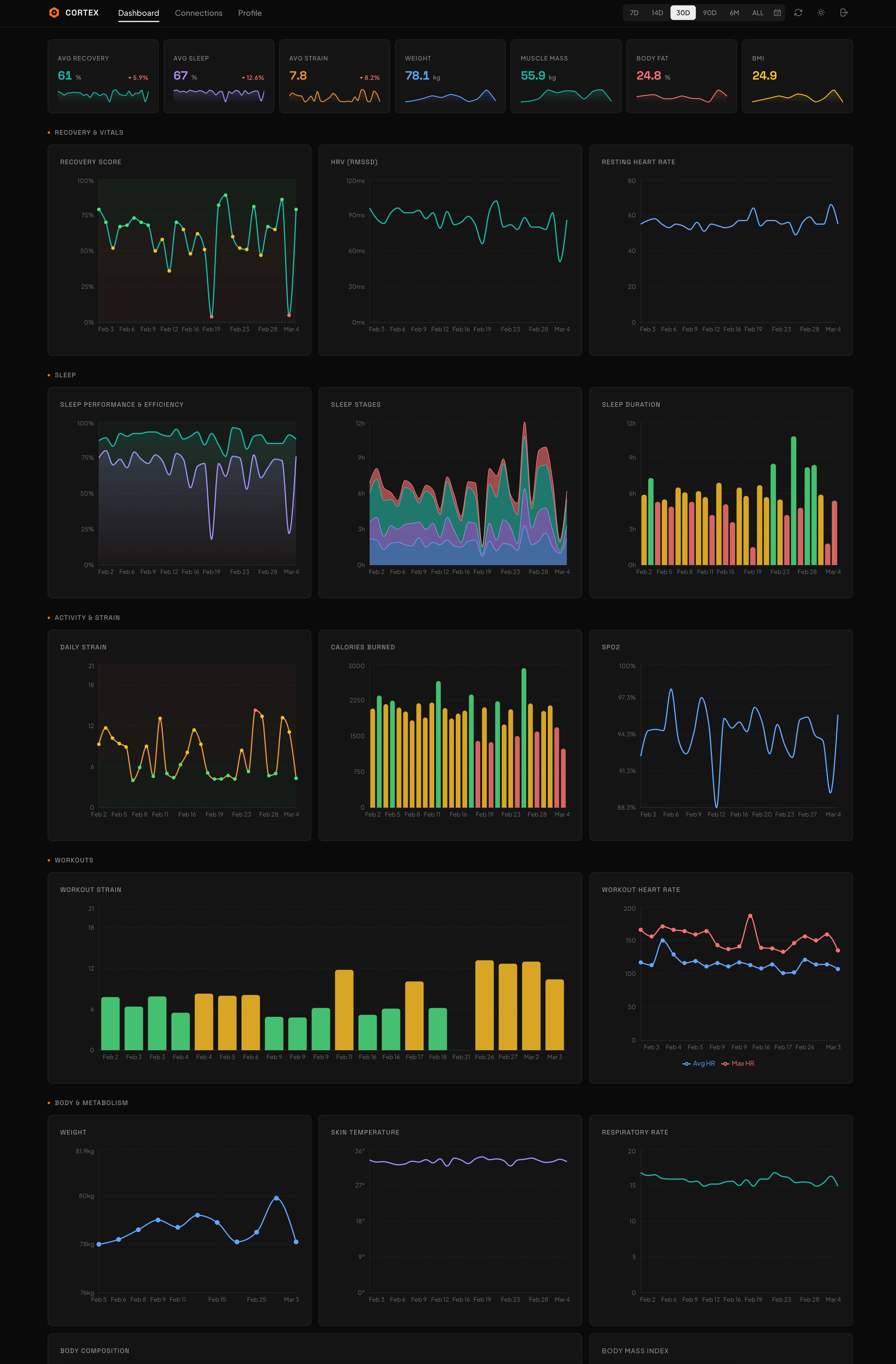 Cortex is a health dashboard that pulls data from WHOOP and Withings into one place. Recovery scores, sleep stages, HRV, strain, weight, body composition, BMR – all of it, charted over time with date range filtering. I built it because I was tired of switching between two apps to understand how my body was doing on any given week.