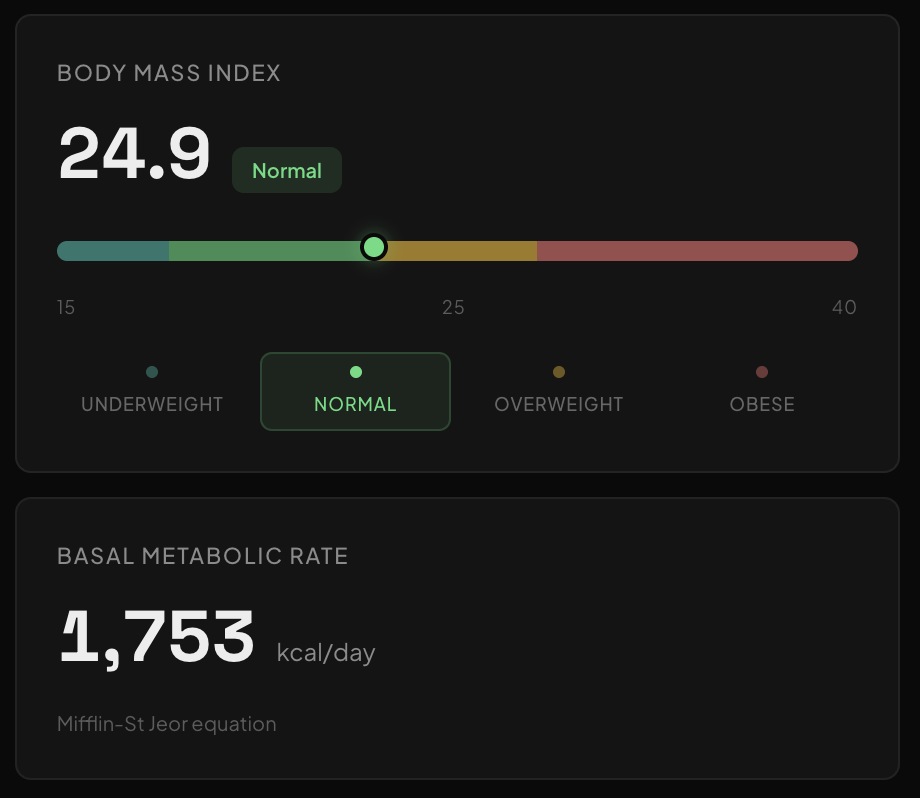 The Withings sync is simpler with just one API call for measurements, but the data mapping has more edge cases. BMI, for instance. Withings sometimes sends it directly. Sometimes it doesn't. When it doesn't, the sync function falls back to calculating it from weight and the most recent height measurement. If there's no height measurement at all, it checks the user's profile for a manually entered height. Three-tier fallback. Same story for BMR: if we have weight, height, age, and gender, we calculate it using the Mifflin-St Jeor equation. If any of those are missing, the field stays null.