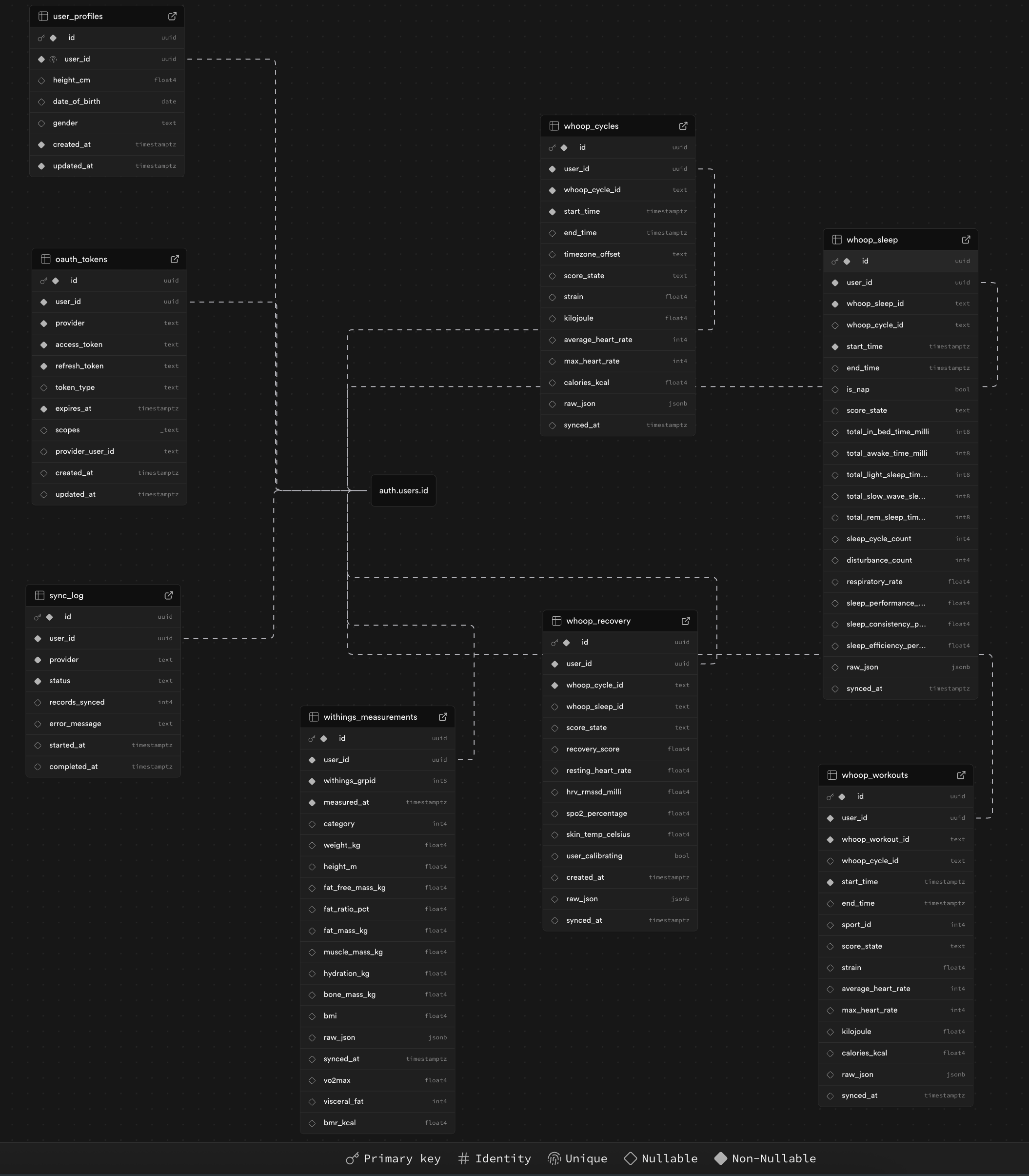 The first migration created the core schema: oauth_tokens for provider credentials, four WHOOP tables (whoop_cycles, whoop_recovery, whoop_sleep, whoop_workouts), withings_measurements for body data, and sync_log for tracking every sync attempt. Each WHOOP table is keyed on (user_id, whoop_*_id) so upserts work cleanly. Every table has an index on (user_id, timestamp DESC) because every query in the app filters by user and sorts by date.
