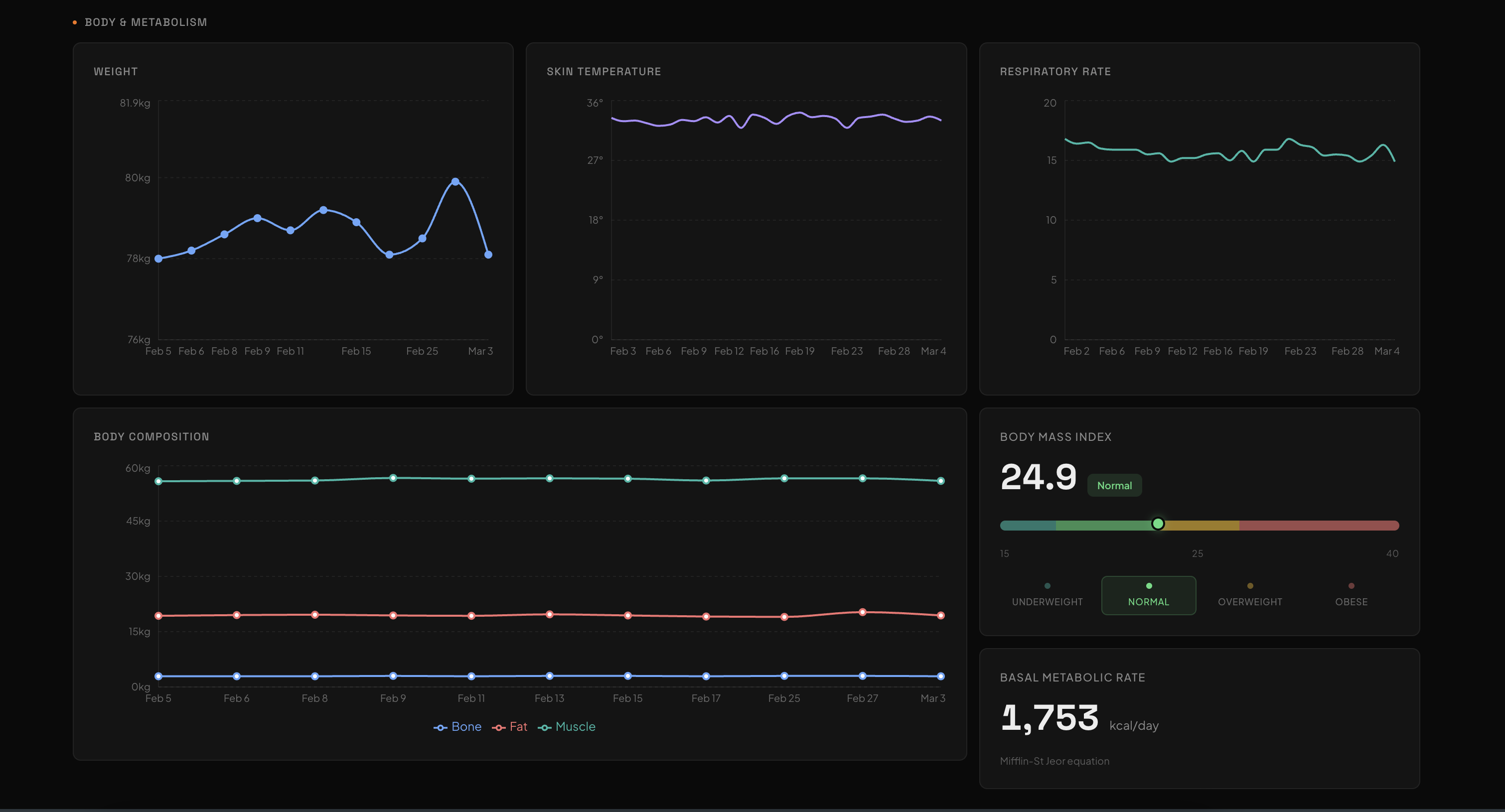 What I wanted was a single screen where I could glance at everything and spot patterns across data sources. Did my HRV drop when my weight went up? Is my sleep performance better in weeks where I'm training harder? These aren't hard questions, but they're impossible to answer when the data lives in two separate apps that don't talk to each other.