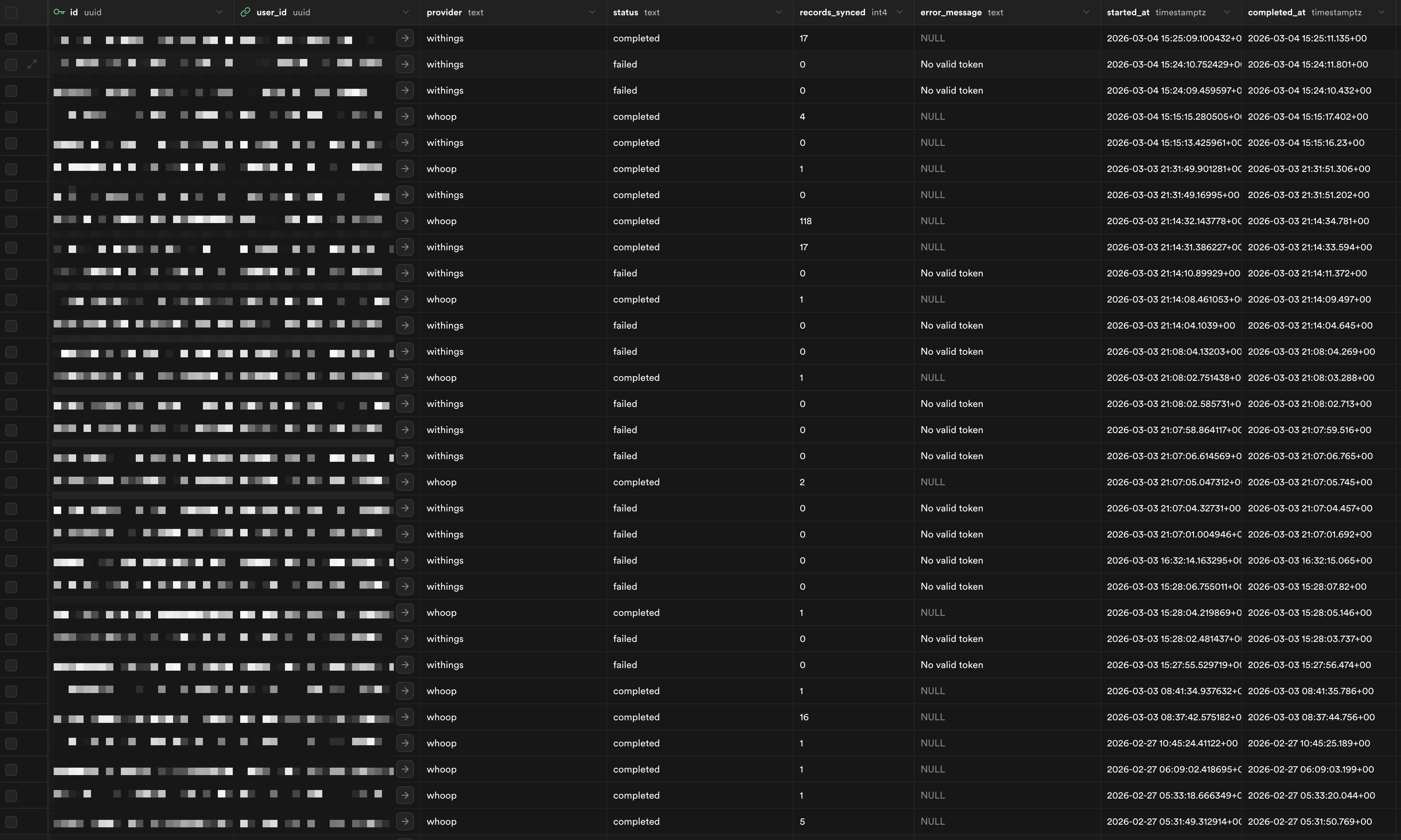Early on, the Withings sync had a bug where it would return early on invalid tokens before inserting a sync log entry. So if your token expired, there was no record that a sync was even attempted. The next sync would still look at the old completed_at timestamp and think everything was fine. I fixed this by moving the log insert to the very first line of the function, before the token check. Now every invocation leaves a trace, successful or not.