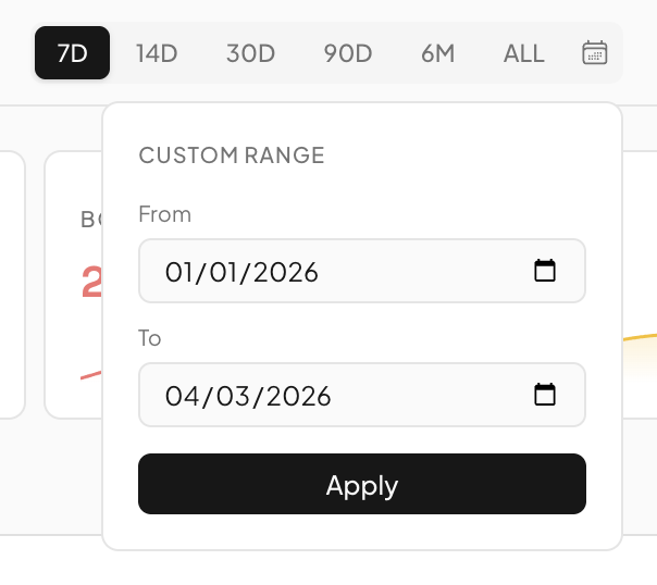 Every chart and metric card is wired to the same date range, managed by a Zustand store. Six preset ranges (7D, 14D, 30D, 90D, 6M, ALL) plus a custom date picker. Changing the range updates the store, which invalidates the React Query cache keys, which triggers fresh API calls for the new window. The selected range persists in localStorage so it survives page reloads.